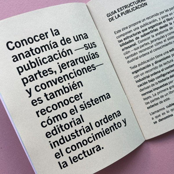 Este zine propone un recorrido por las partes que componen una publicación, y pone en reflexión las estructuras que organizan el libro y las posibilidades de subvertirlas desde la publicación artesanal. Conocer la anatomía de una publicación —sus partes, jerarquías y convenciones— es también reconocer cómo el sistema editorial industrial ordena el conocimiento y la lectura.